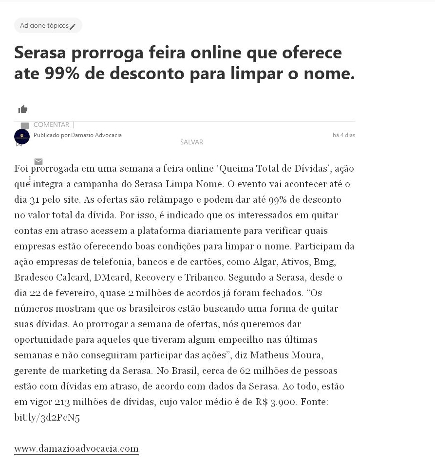 https://damazioadvocacia2717.jusbrasil.com.br/noticias/1184317158/serasa-prorroga-feira-online-que-oferece-ate-99-de-desconto-para-limpar-o-nome