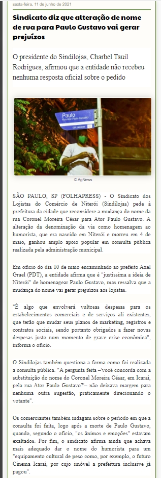 Sindicato diz que alteração de nome de rua para Paulo Gustavo vai gerar prejuízos