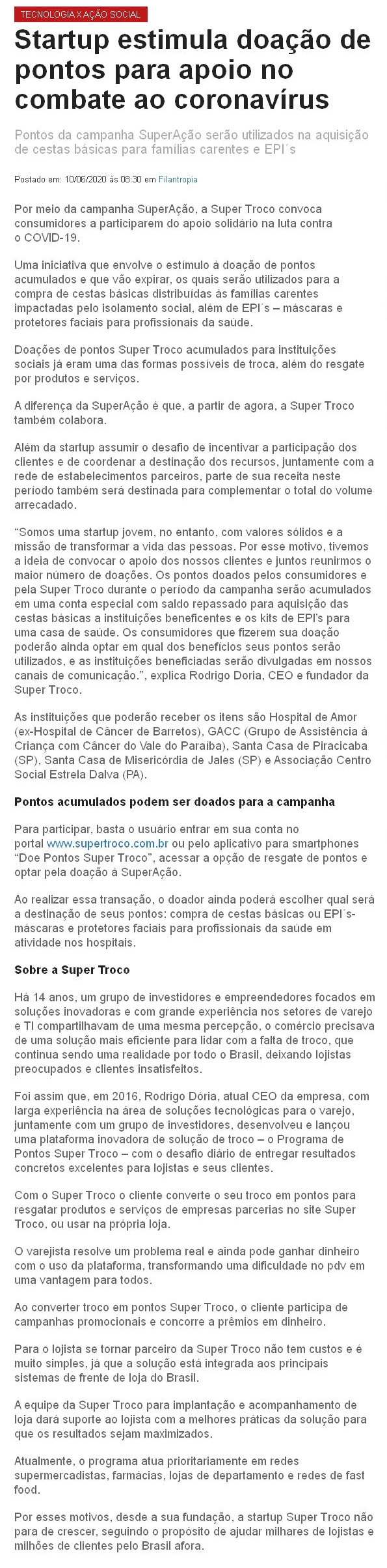 Super Troco estimula doação de pontos para apoio no combate ao coronavírus