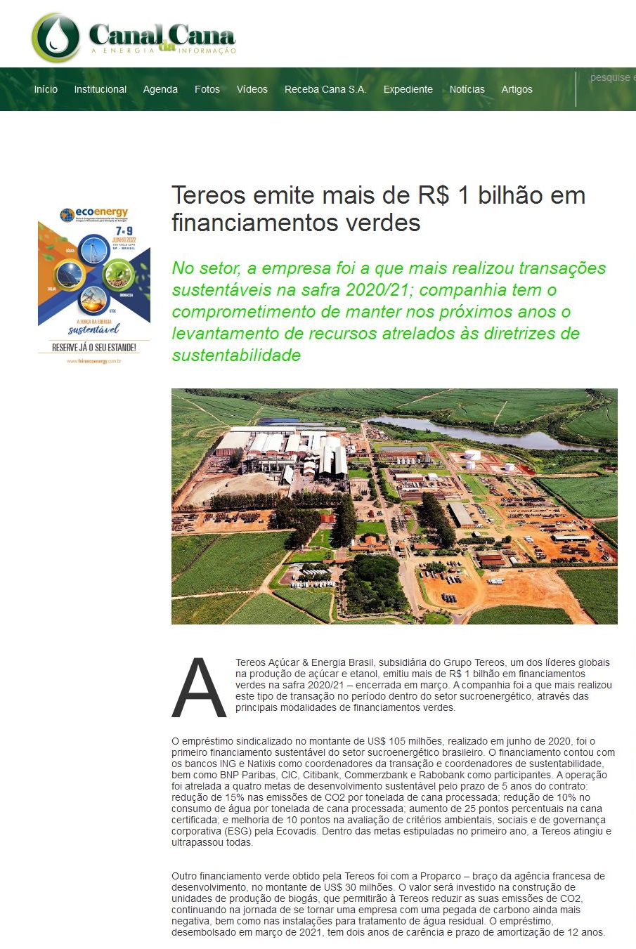 Tereos emite mais de R$ 1 bilhão em financiamentos verdes