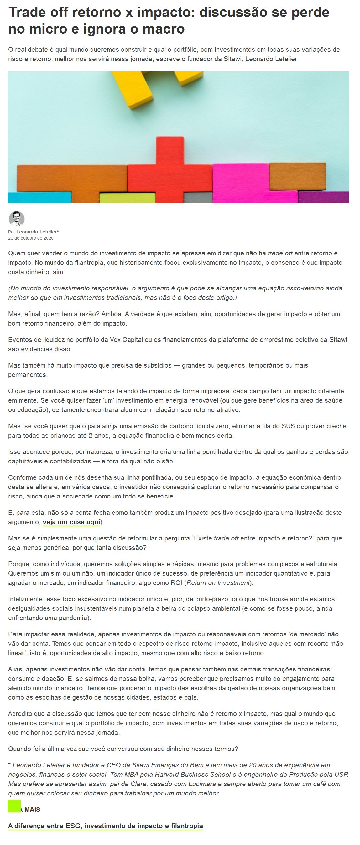 Trade off retorno x impacto: discussão se perde no micro e ignora o macro