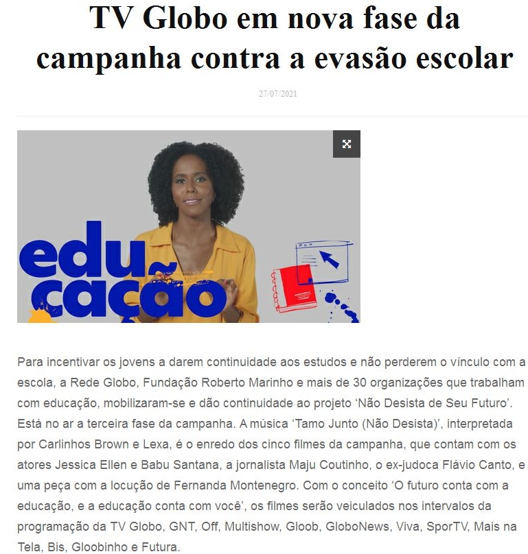 TV Globo em nova fase da campanha contra a evasão escolar
