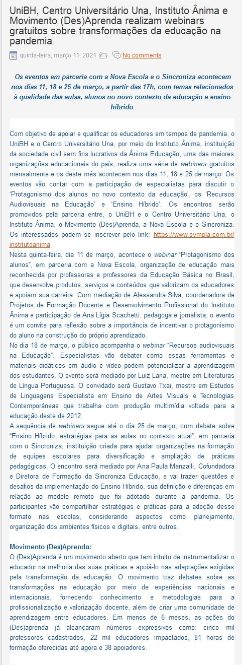 UniBH, Centro Universitário Una, Instituto Ânima e Movimento (Des)Aprenda realizam webinars gratuitos sobre transformações da educação na pandemia