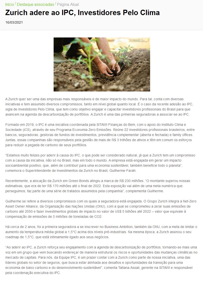 Zurich adere ao IPC, Investidores Pelo Clima